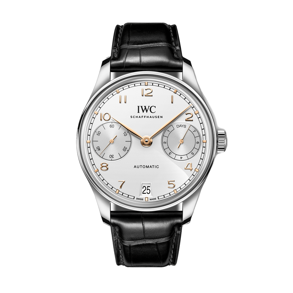 「ポルトギーゼ」の起源は1930年代末にまで遡ります。クロノメーターに匹敵する精度を持つ極めて大型の腕時計を制作するために、IWCシャフハウゼンの高精度ポケットウォッチ・ムーブメントが使われたのです。2000年に初めて登場した「ポルトギーゼ・オートマティック 42」は、すっきりとしたバランスの良い文字盤を持ち、3時位置にパワーリザーブ表示、反対側の9時位置にスモールセコンドを備えています。直径42.4mmのステンレススティール製ケースに、シルバーメッキの文字盤、ゴールドメッキの針とアップライト・インデックスが組み合わされています。よりスリムなケーシングリングを採用し、デザインを隅々まで見直した結果、エレガントで洗練された印象に仕上がりました。ケースのフロントとバックには、ボックス型のサファイアガラスが使われています。60もの工程からなる複雑なプロセスを経て作られる文字盤は精巧な仕上がりで、格別な魅力を放ちます。透明なラッカーを15層に塗り重ねることで比類のない美しい奥行きが生まれ、つややかな光沢を放つまで丁寧な研磨とポリッシュ仕上げが施されます。サブダイヤルは機械加工により、真鍮製の地板とラッカー層の両方に組み込まれます。そして、特殊なプリント工程で構造の立体感を一段と際立たせます。最後に、アップライト・インデックスを文字盤の上に手作業で一つひとつ設置します。「ポルトギーゼ・オートマティック 42」を駆動するムーブメントは、精巧なサーキュラーグレインおよびコート・ド・ジュネーブ装飾をまとうIWC自社製キャリバー52011。ほとんど摩耗しない酸化ジルコニウムセラミック製部品で強化されたぺラトン自動巻き機構を搭載し、2つの香箱に7日間(168時間)のパワーリザーブを蓄えます。このモデルには、ステンレススティール製フォールディング・クラスプを持つブラックのアリゲーター・ストラップが合わせられています。 アクセサリー 時計をパーソナライズする幅広いアクセサリーが揃っています ス