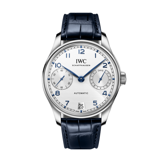「ポルトギーゼ」の起源は1930年代末にまで遡ります。クロノメーターに匹敵する精度を持つ極めて大型の腕時計を制作するために、IWCシャフハウゼンの高精度ポケットウォッチ・ムーブメントが使われたのです。2000年に初めて登場した「ポルトギーゼ・オートマティック 42」は、すっきりとしたバランスの良い文字盤を持ち、3時位置にパワーリザーブ表示、反対側の9時位置にスモールセコンドを備えています。直径42.4mmのステンレススティール製ケースに、シルバーメッキの文字盤、ブルーの針とアップライト・インデックスが組み合わされています。よりスリムなケーシングリングを採用し、デザインを隅々まで見直した結果、エレガントで洗練された印象に仕上がりました。ケースのフロントとバックには、ボックス型のサファイアガラスが使われています。60もの工程からなる複雑なプロセスを経て作られる文字盤は精巧な仕上がりで、格別な魅力を放ちます。透明なラッカーを15層に塗り重ねることで比類のない美しい奥行きが生まれ、つややかな光沢を放つまで丁寧な研磨とポリッシュ仕上げが施されます。サブダイヤルは機械加工により、真鍮製の地板とラッカー層の両方に組み込まれます。そして、特殊なプリント工程で構造の立体感を一段と際立たせます。最後に、アップライト・インデックスを文字盤の上に手作業で一つひとつ設置します。「ポルトギーゼ・オートマティック 42」を駆動するムーブメントは、精巧なサーキュラーグレインおよびコート・ド・ジュネーブ装飾をまとうIWC自社製キャリバー52011。ほとんど摩耗しない酸化ジルコニウムセラミック製部品で強化されたぺラトン自動巻き機構を搭載し、2つの香箱に7日間(168時間)のパワーリザーブを蓄えます。このモデルには、ステンレススティール製フォールディング・クラスプを持つブルーのアリゲーター・ストラップが合わせられています。