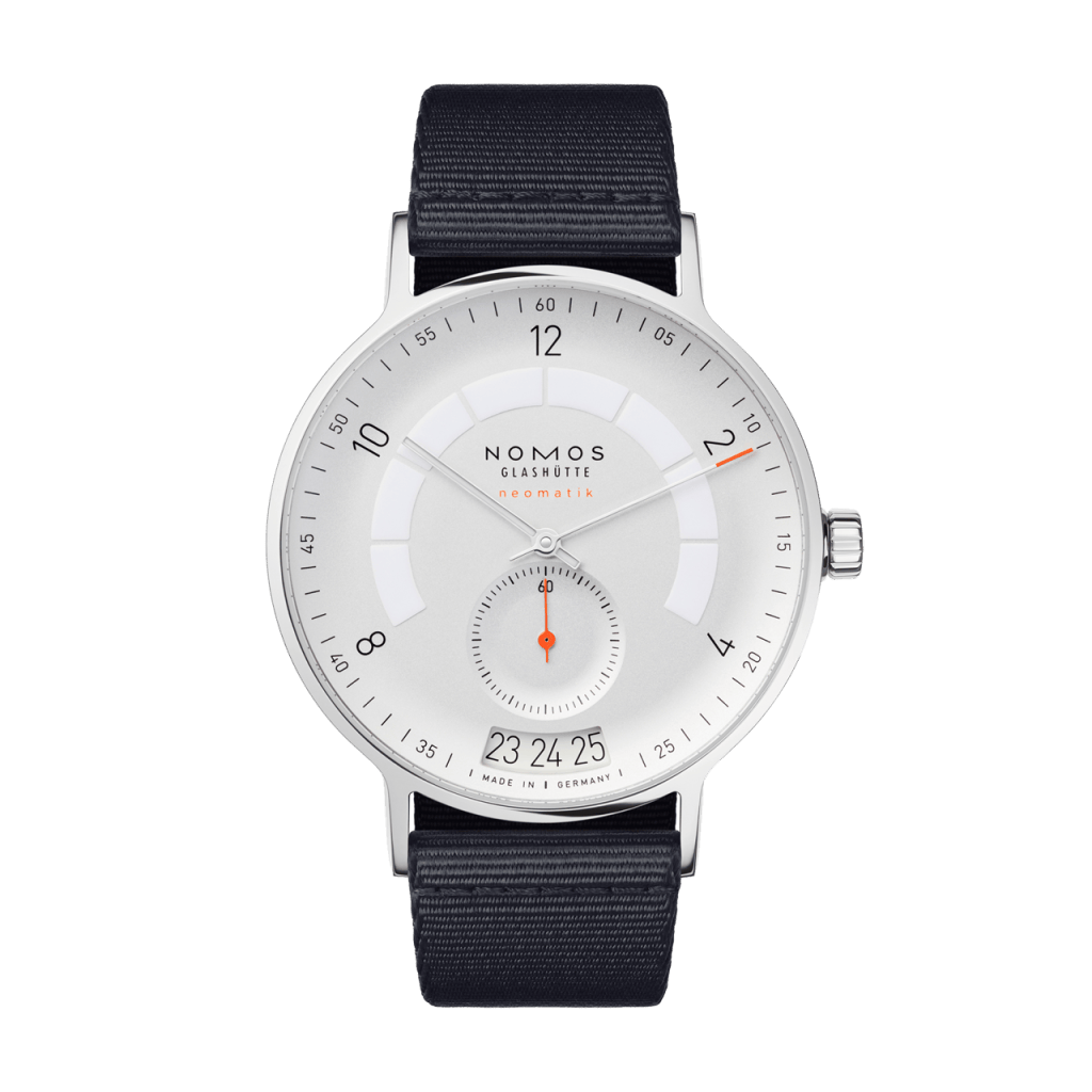 世界的デザイナー、ヴェルナ・アイスリンガーにより生まれた「アウトバーン」シリーズの落着きあるホワイトシルバーカラーのモデル。 ヴィンテージカーのメーターをイメージしたデザイン。 3つの数字を表示したワイドな日付表示窓。時間のインデクスに塗布されたスーパールミノバは、スピードメーターの表現と共に夜間の視認性を上げる為です。 特許登録済の自社開発のカレンダー機能(日付送り戻し両方向可能/操作禁止時間帯でのスライドによる操作回避機能)付き超薄型自動巻きムーブ「DUW6101」を搭載し10気圧防水。 伝統・革新・緻密が融合されたノモスの挑戦的なスポーツモデルです。