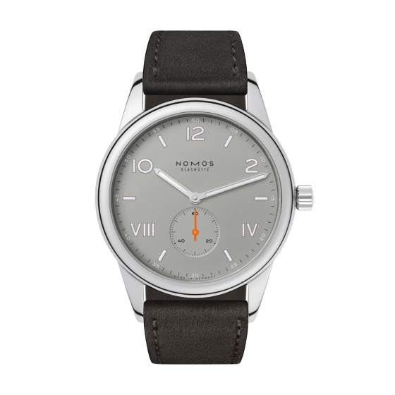「クラブキャンパス」シリーズは、新生活を始めるキャリアスタートの節目に生涯で価値ある時計を身に着けて欲しい願いをノモス社が込めて作りました。 曲線を多く取り入れたケースにローマ数字とアラビア数字を組み合わせた独特のバイリンガルダイヤル。 スーパールミノバを施したインデクスと時分針は暗闇でもしっかり時を教えてくれます。 アブソルートグレイダイヤルにパープル色に縁取ったインデクスとアクセントとなるネオンオレンジの秒針はフレッシュな印象を与え、新たな始まり、未来を表すダイヤルデザインに仕上げています。 10気圧防水を備える38㎜径ケースは多少の水しぶきに影響されずにムーブメントを守ります。 ムーブメントは高精度「α」ムーブを搭載。 これからのタフな人生のパートナーとして活躍してくれる時計です。