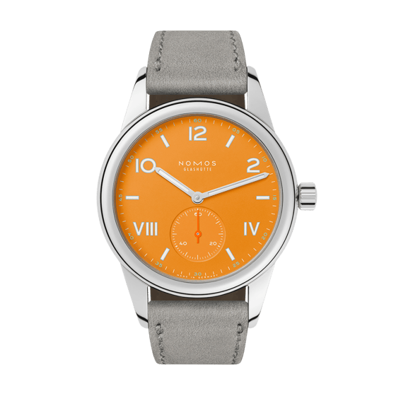 「クラブキャンパス」シリーズは、新生活を始めるキャリアスタートの節目に生涯で価値ある時計を身に着けて欲しい願いをノモス社が込めて作りました。 曲線を多く取り入れたケースにローマ数字とアラビア数字を組み合わせた独特のバイリンガルダイヤル。 スーパールミノバを施したインデクス時分針は暗闇でもしっかり時を教えてくれます。 フューチャーオレンジダイヤルはポジティブでフレッシュな印象を与え、新たな始まり、未来を表すダイヤルデザインに仕上げています。 10気圧防水を備える36㎜径ケースは多少の水しぶきに影響されずにムーブメントを守ります。 ムーブメントは高精度「α」ムーブを搭載。 これからのタフな人生のパートナーとして活躍してくれる時計です。