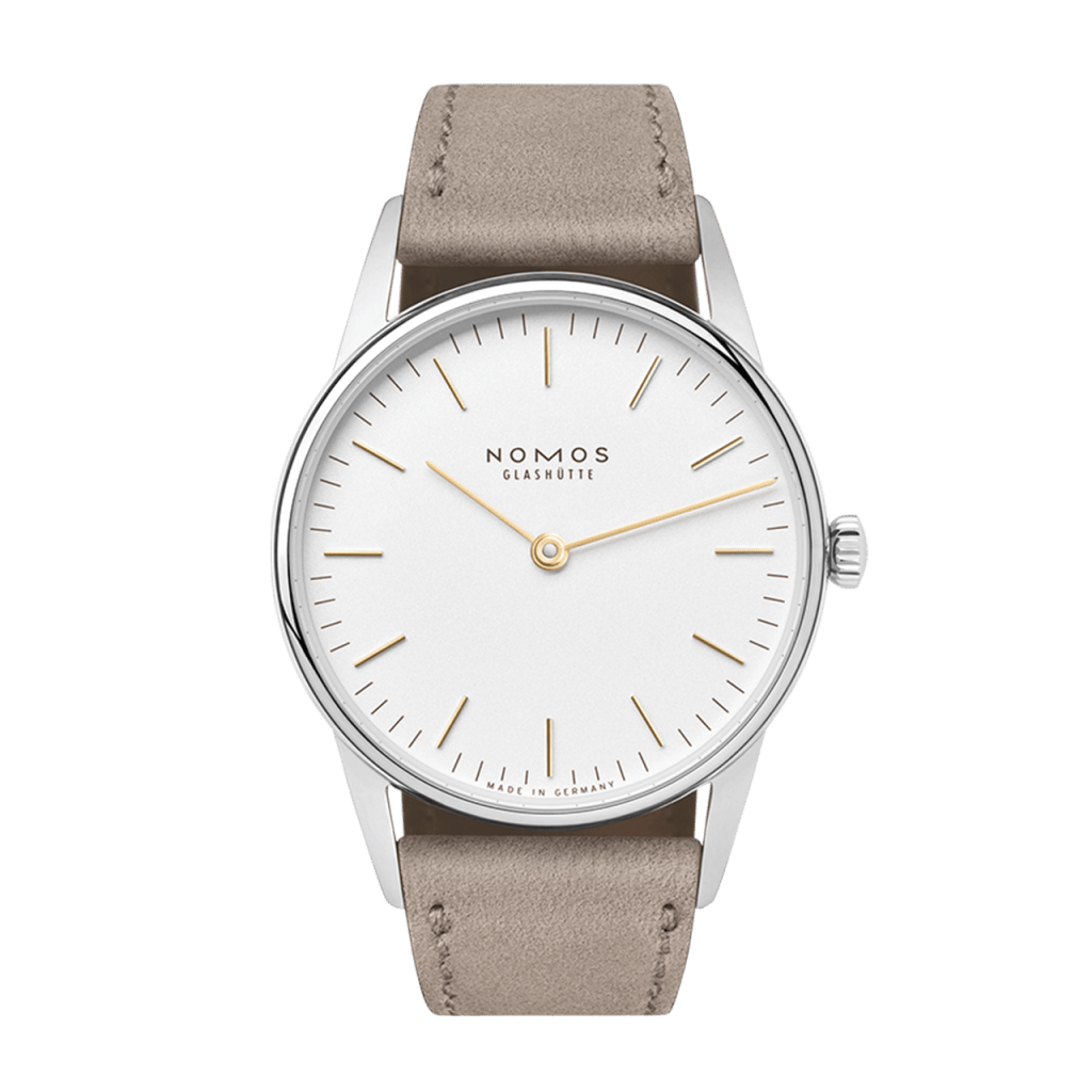 ノモスウォッチ初の2針の時計。 定番の「オリオン」をベースとして、よりシンプルでエレガントを追求してできたモデルです。 繊細な腕元を意識した33mm径のケースサイズに曲線で構成されるケースとドーム型サファイヤクリスタルガラス、シルバー色のケースとゴールド色の針の組み合わせはジュエリーの様な華やかさをもたらします。 数秒の違いに拘束されない生活を送る人向けの時計です。