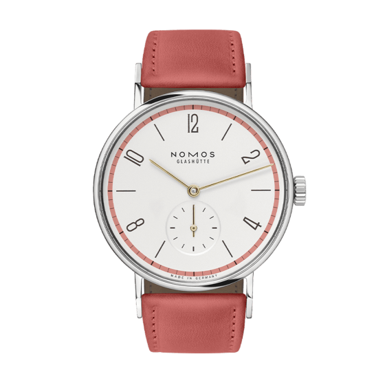 最定番モデル「タンジェント」をベースとした、日本限定モデル「秋35」。バウハウス100周年とノモス社創業30周年、日本上陸20周年を記念し誕生しました。 ノモスからみた日本の豊かな四季をイメージして、ダイヤル外周にリング状のカラーとストラップに季節に合わせた色を施しました。 ストラップは天然の草木染めを1本1本丁寧に染上げた柔らかみある色合いの革ストラップを装着。 秋35㎜は「茜」で染上げた革ストラップ。付属で純正テキスタイルナイロンストラップもついてます。 限定生産60本でシリアルナンバー入りです。