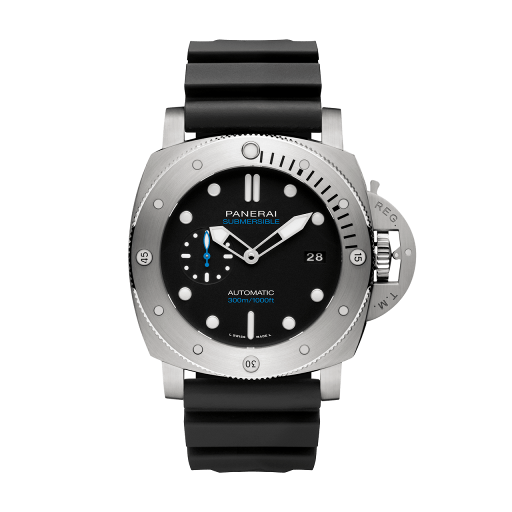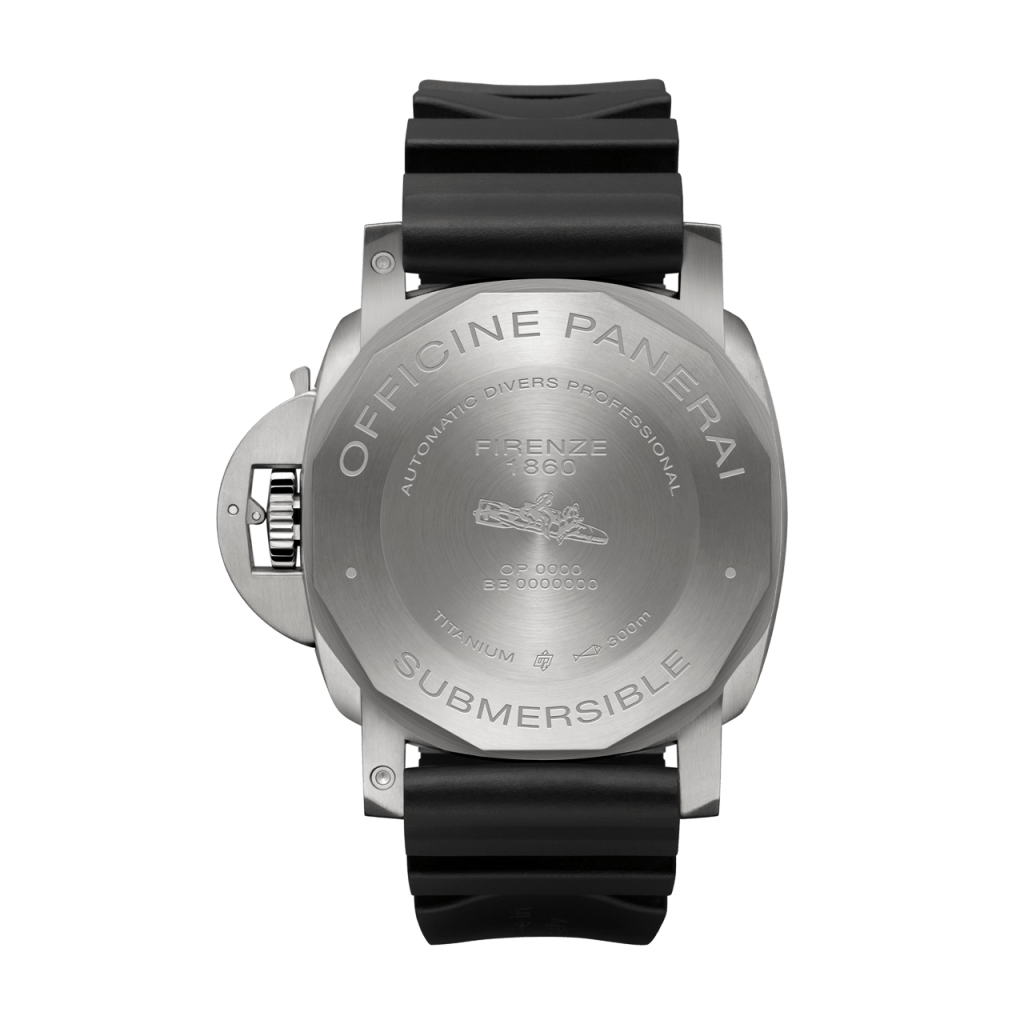 ケースはすべてチタン製。軽量かつ腐食耐性や耐衝撃性に優れ、直径47mmのケースの重量を抑えるのに理想的な素材です。夜あるいは水中では、分針とベゼル上の12時位置のスタッド型マーカーがブルーに、他のマーカーは従来の蛍光グリーンに発光します。これにより視認性がいっそう高まり、潜水経過時間の読み取りを誤ることもありません。