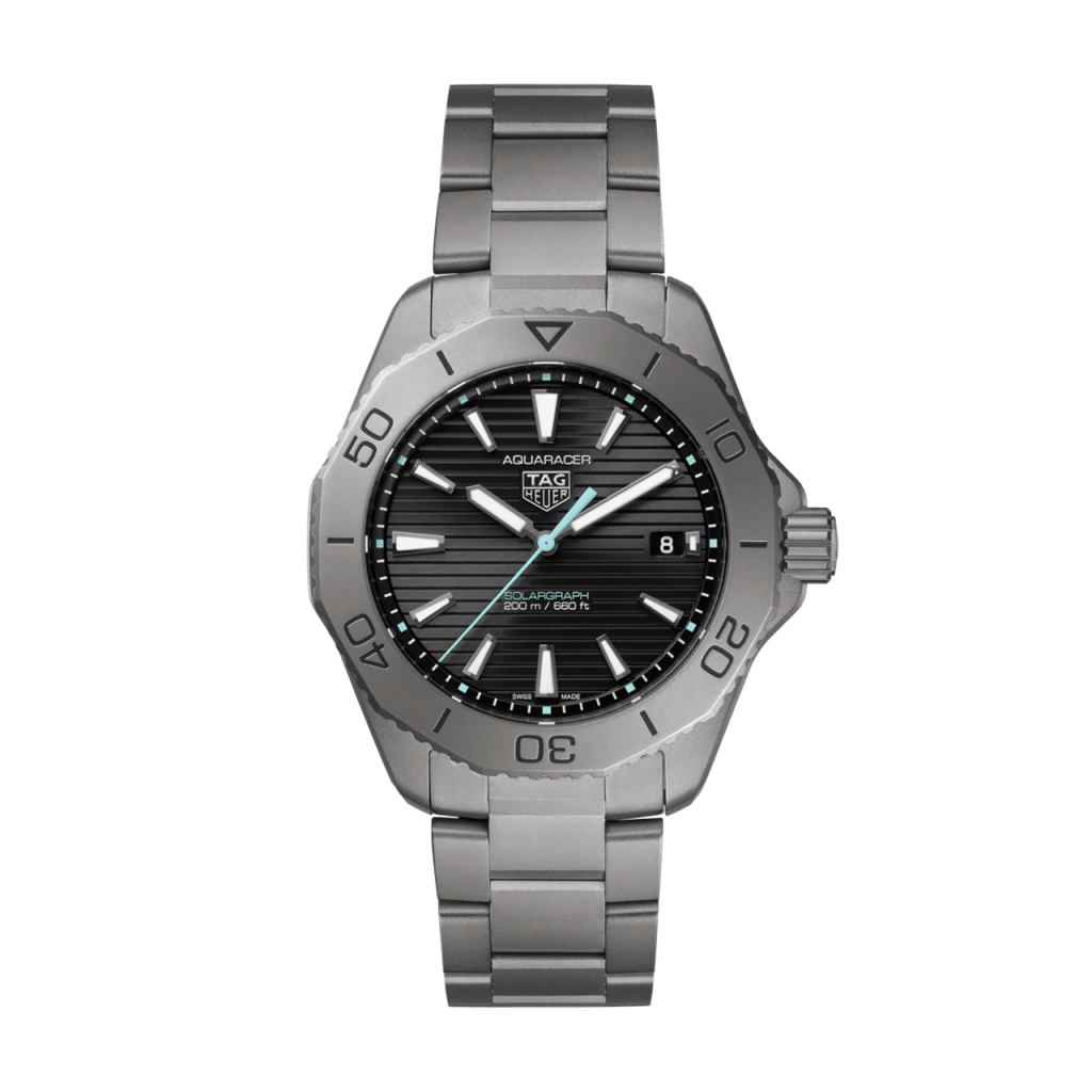 ソーラーグラフ テクノロジー、ソーラー駆動型ムーブメントを取り入れた、ケース径40mmのタグ・ホイヤー アクアレーサー プロフェッショナル200 ソーラーグラフ。軽量でスリムなデザインと頑丈なグレード2チタンで、どんな状況でも最大限の堅牢性と汎用性を発揮します。スポーツと自然を愛するすべての人のためのウォッチです。