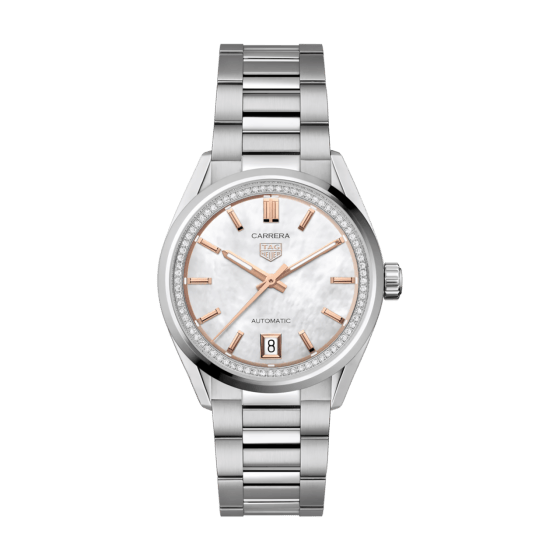 タグ・ホイヤー カレラ デイトが魅せる、タイムレスなエレガンスの世界へ。直径36mmのケースに、ホワイトマザー オブ パール のダイヤルと、76個のダイヤモンド(0.288ct) がセットされたフランジを合わせた壮麗なタイムピースが、アイコニックなカレラ コレクションにラグジュアリーなタッチを添えます。