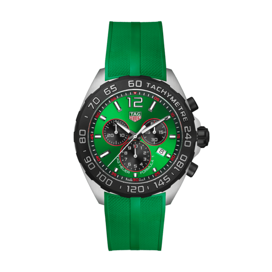 カラーとスタイルでペースを上げる、タグ・ホイヤー フォーミュラ1。ビビッドなグリーンのダイヤルとそれにマッチしたラバーストラップを備えた、汎用性に優れた43mmサイズのクロノグラフです。スポーティなデザインコードが散りばめられたモーターレーシングコレクションが、勝利へと走り抜けます。