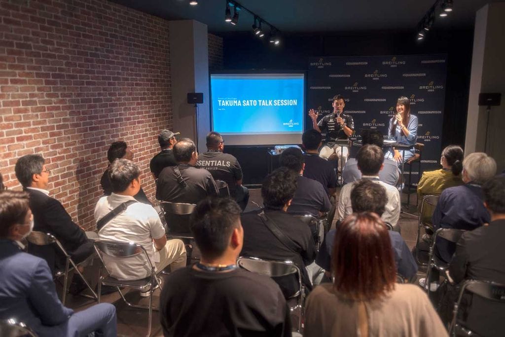佐藤さんにお試しいただいたのは、「スーパークロノマット B01 44」チタン素材で登場した最新モデル。佐藤さんからは「マット感のある渋い色合いで、チタンならではの軽さとサラッとした肌触りが良いですね。モノトーンかと思いきや針がブルーなのもオシャレですね!」と感想をいただき、ご参加の皆様も佐藤琢磨さんおススメモデルと合って興味がそそられたようでした。