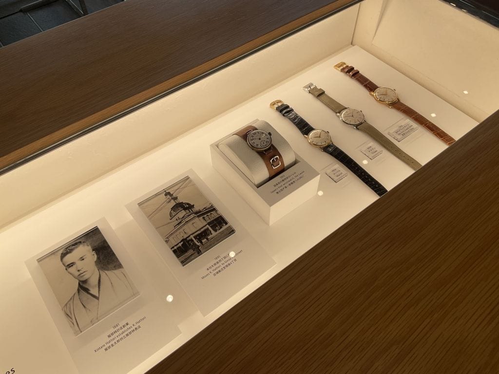 スタジオ入口には初代グランドセイコーやブランドの歴史、機械式腕時計を分解したパーツなどの展示コーナーがございます。