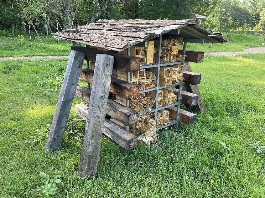 そしてスタジオの傍らにはさまざまな生物が互いに支え合って暮らす空間「ビオトープ」があります。ここでは虫や小動物用のインセクトホテルが設置されており、また、雨水や井戸水に含まれる窒素を分解する自然ろ過を行う丘で浄化された水が貯められている人工池があります。