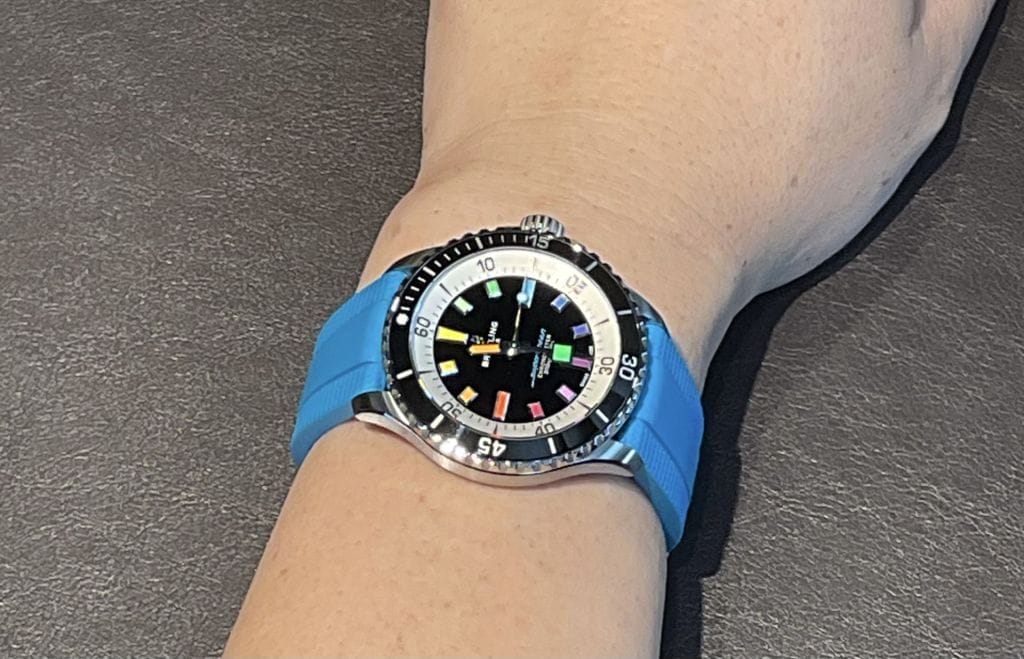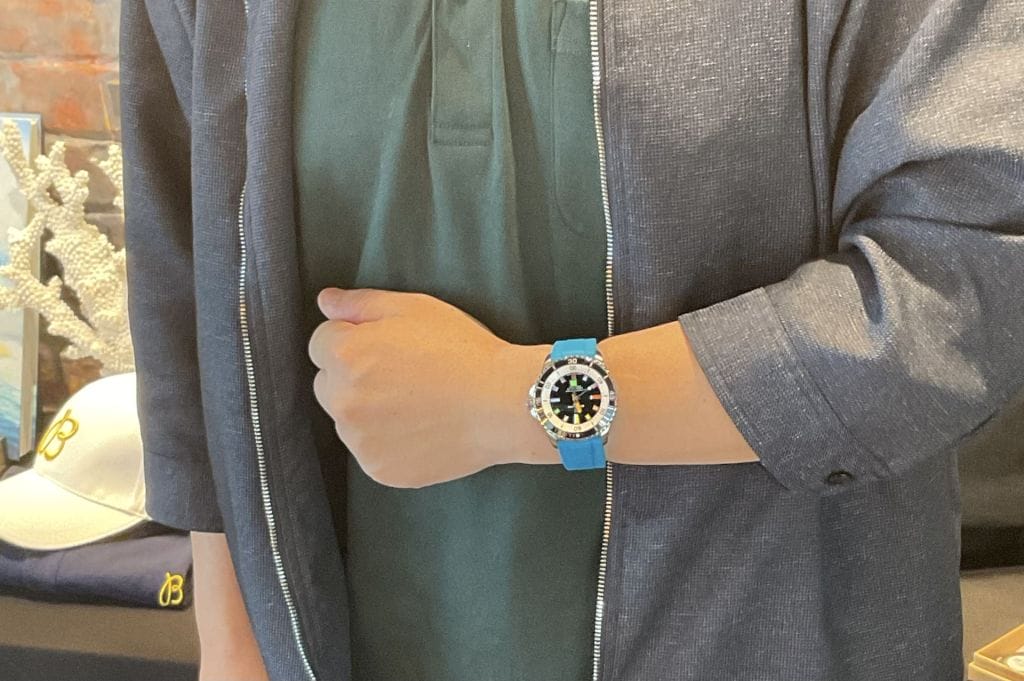 ターコイズカラーのスポーティーなラバーストラップがなんと言っても特別感があり魅力的ですよね!初のブライトリングの機会に立ち会うことができ非常に嬉しく思います。