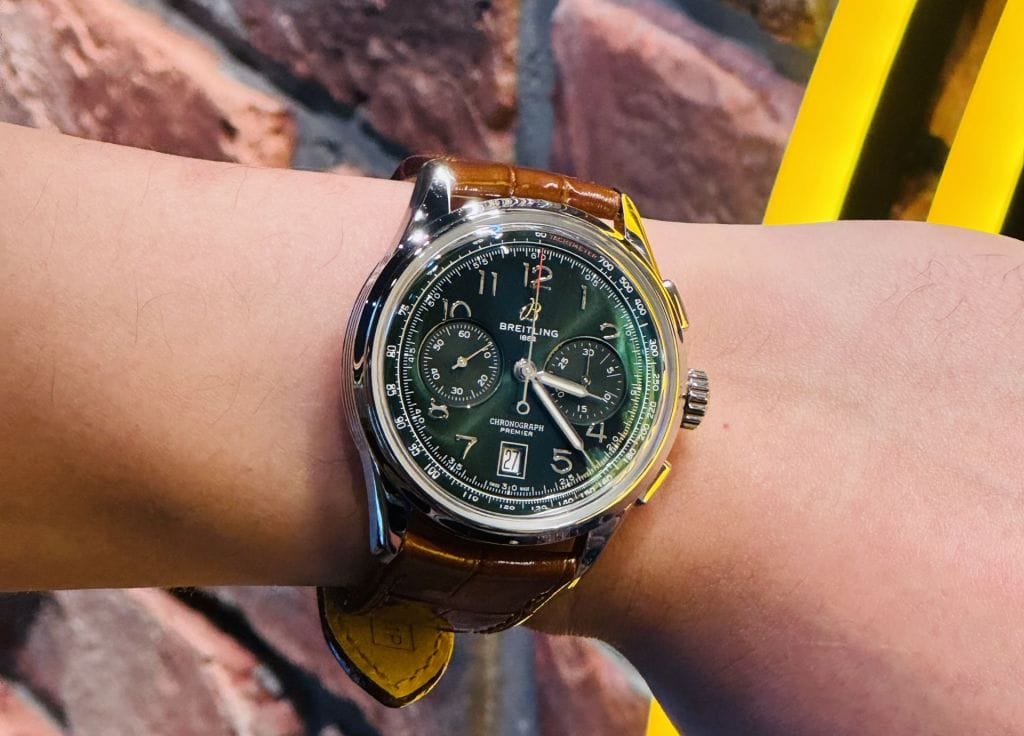 存在感抜群のケースサイズに落ち着いたグリーン文字盤がより華やかでクラシカルな印象になっております。