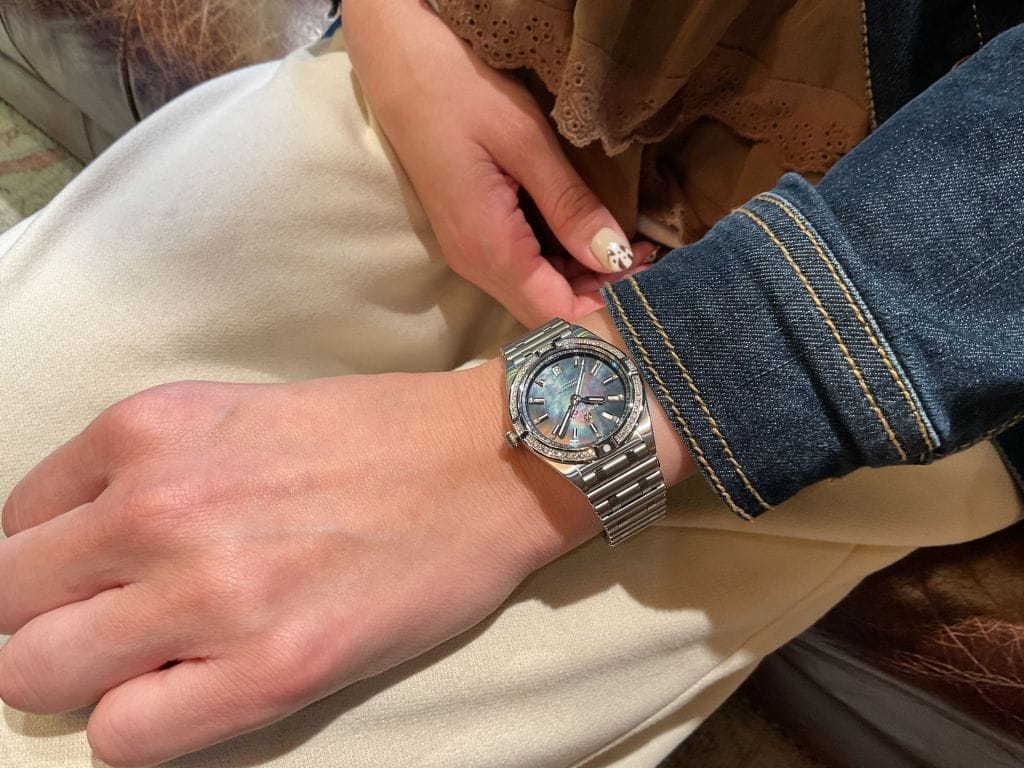 主人の時計メンテナンス時に試着、ダイヤとMOPの輝きが気に入りました。