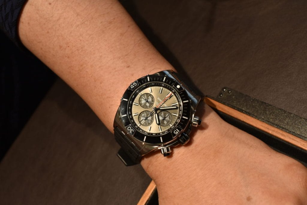「だいぶ変わりましたよね~」と新たなブライトリングモデルをご試着頂きながら、