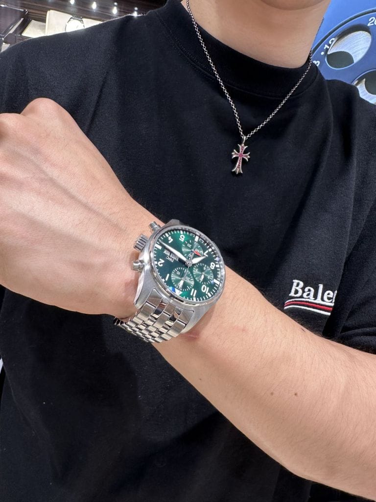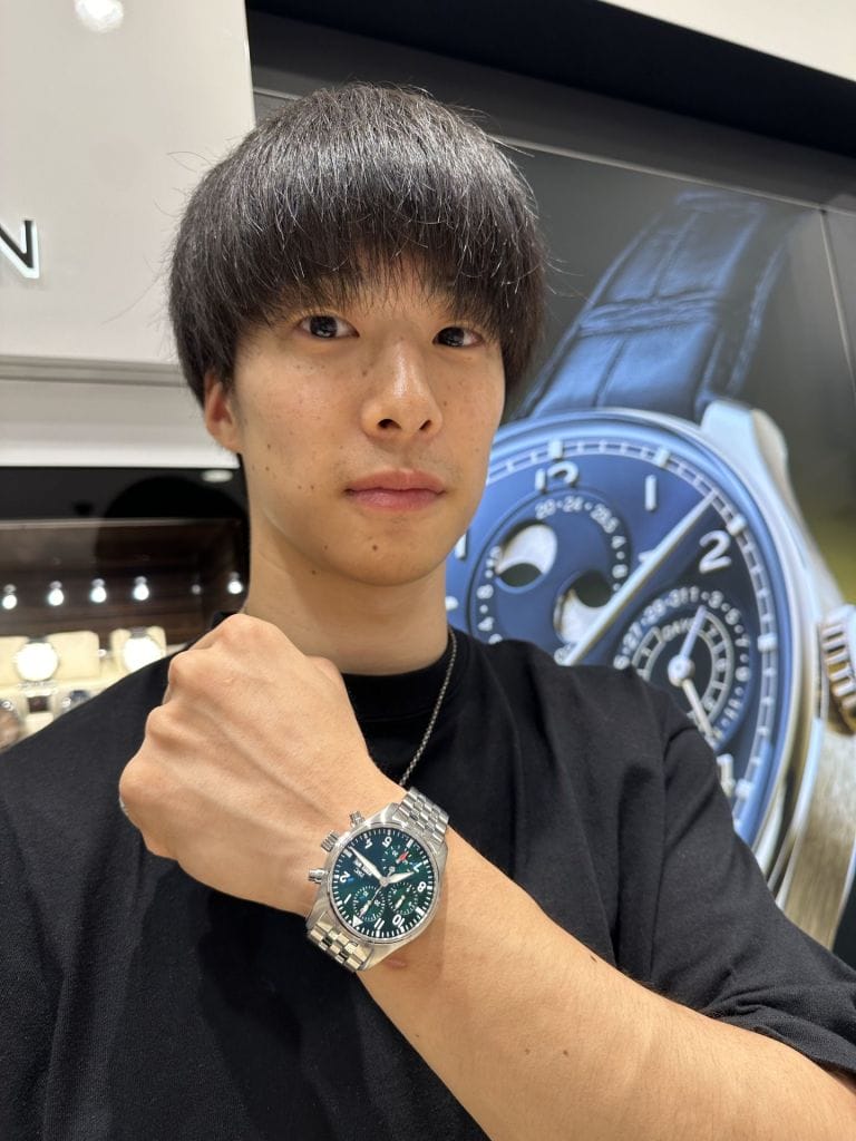 やはりこの美しいグリーンの色味は、何度見ても素敵ですよね!映画のTOPGUNが大好きだとおっしゃっていたので、そんな理由もパイロットウォッチを選ばれた決め手となった事と思います。