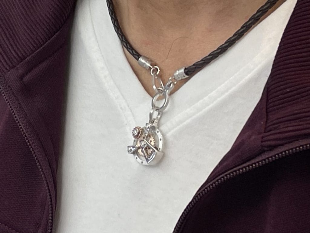 とっても人気の歯車デザインのトップを革のネックレスに合わせた組み合わせです。
