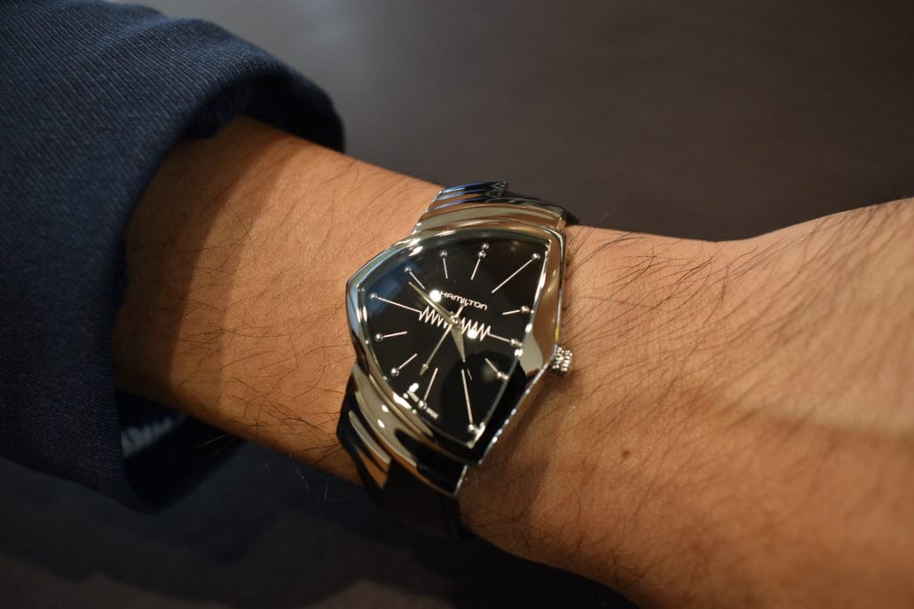 三角の形が特徴的なベンチュラはカジュアルなファッションにもスーツにも似合う時計となり本日のS様のお召しのもにもとてもお似合いでした^ ^